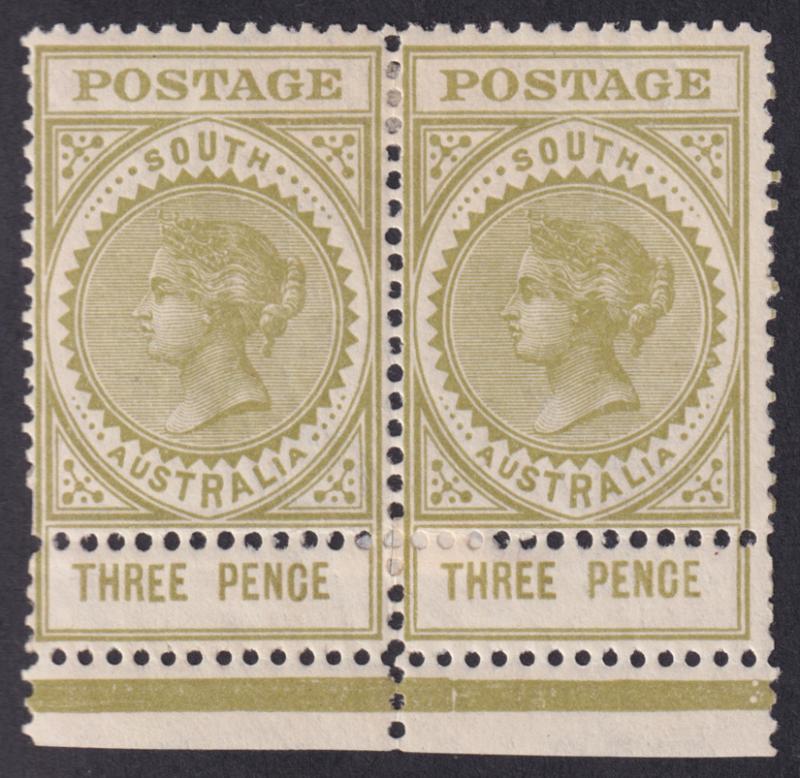1906-12 Thick 'POSTAGE' Crown/A Tall Stamps 3d olive Perf 11 Misperforated above the Value Tablet & Corrected with an Additional Line of Perf 11 (with smaller holes, from a different machine) ACSC S37b (SG 298e var) horizontal pair from the base of the sheet, thin band of toning & hinge remainder, Cat $5000+ (£2400+ for normal stamps) for singles. Ex 'Dubois' (Part 1): sold for SFr1035. This is the pair illustrated in the ACSC 'Federal Period 1901-12' at page 131. Absent from Don Pearce's formidable collection. (Image1)