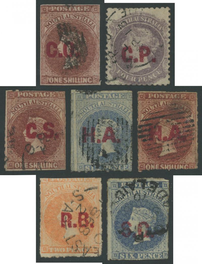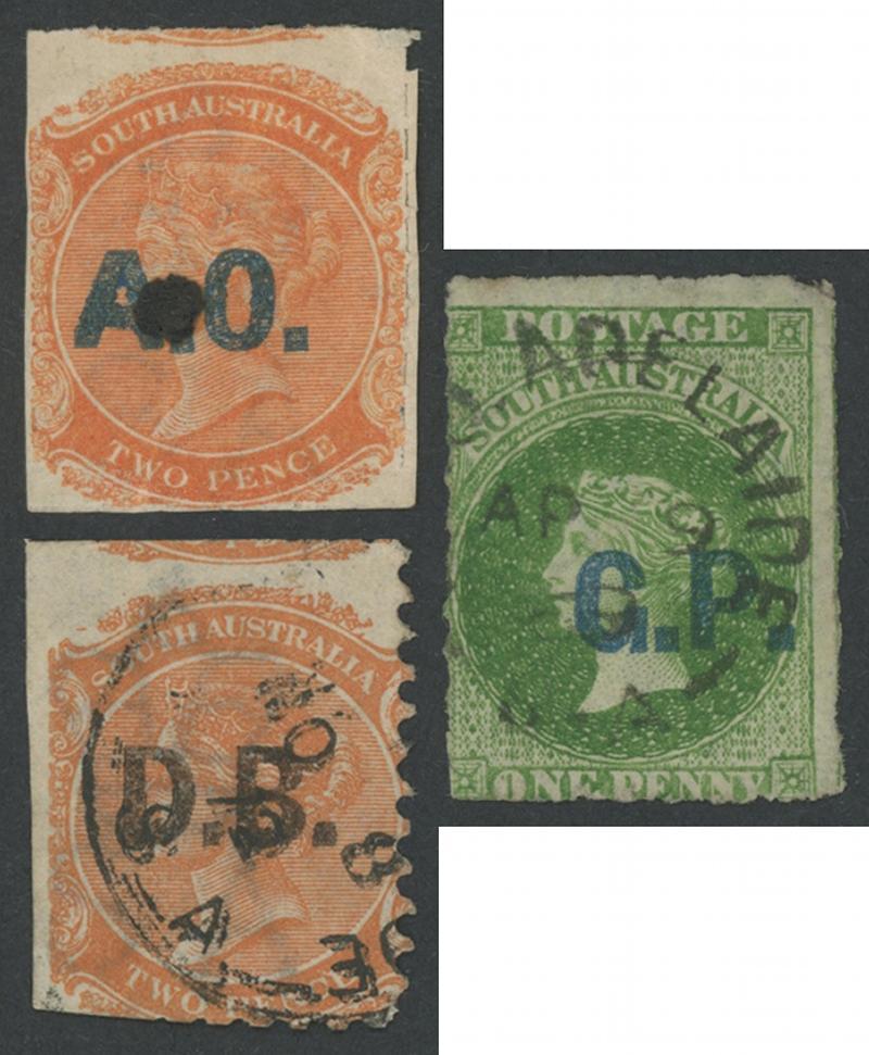 Quintet comprising Blue 'A.O.' on Crown/SA Rouletted 2d SG DO32 (apparently unused but with central ink-stain) and 'G.P.' on Perkins Bacon Rouletted 1d yellow-green DO231 (fine); and Black on Crown/SA Rouletted 2d 'O.A.' DO384 and 'S.G.' DO506 (both defective) and Perf 10 'D.B.' DO186 (trimmed perfs); Cat £1970.