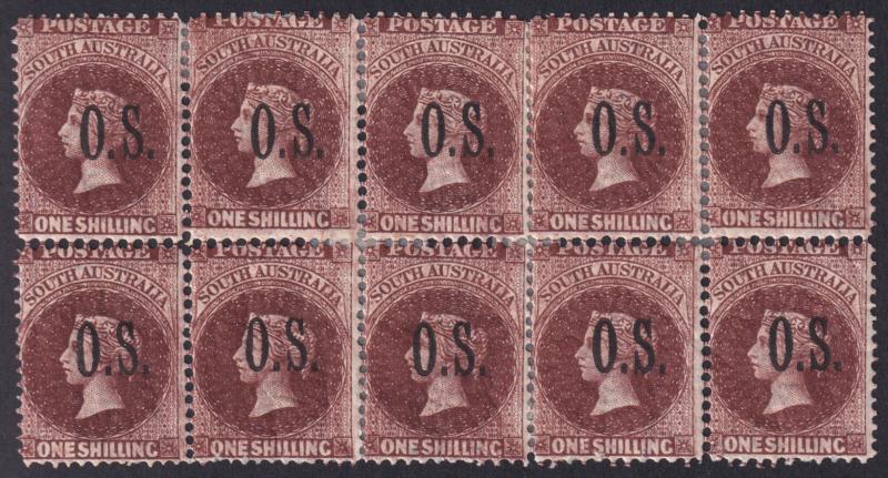 1891-1902 Thin 'O.S.' Narrow Setting Wmk Large Crown/SA 1/- deep red-brown SG O36 block of 10 (5x2) SG O74 block of 6 (3x2), a bit fragile with reinforcing of the perfs, Cat £1100+ for mounted singles. (Image1)