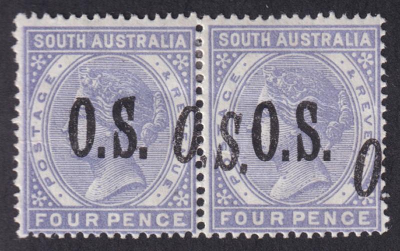 1893-95 Thin 'O.S.' Narrow Setting 4d lilac with 'O.S.' Double One Diagonal SG O66a horizontal pair, hinge remainder, Cat £1200+ for singles. A striking error. Don Pearce's similar pair - lightly mounted - sold for $1255 (Sale 249 Lot 1490). (Image1)