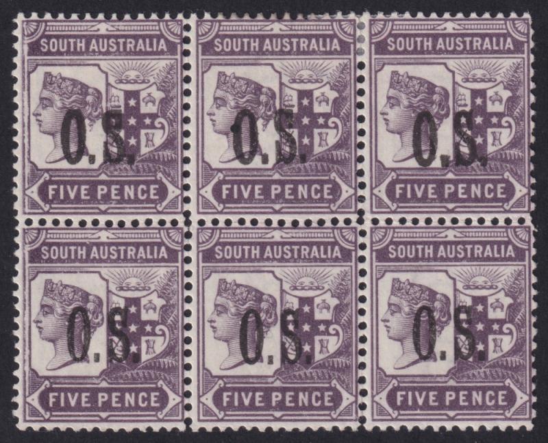 1897-1901 Thin 'O.S.' Narrow Setting Perf 15 5d purple SG O74 block of 6 (3x2), a bit fragile, lightly mounted & the lower units are unmounted, Cat £780+ for mounted singles. (Image1)