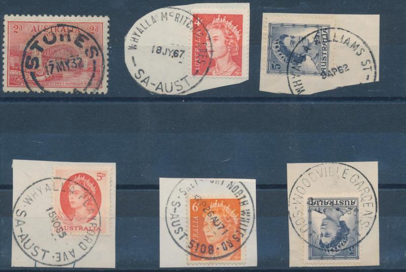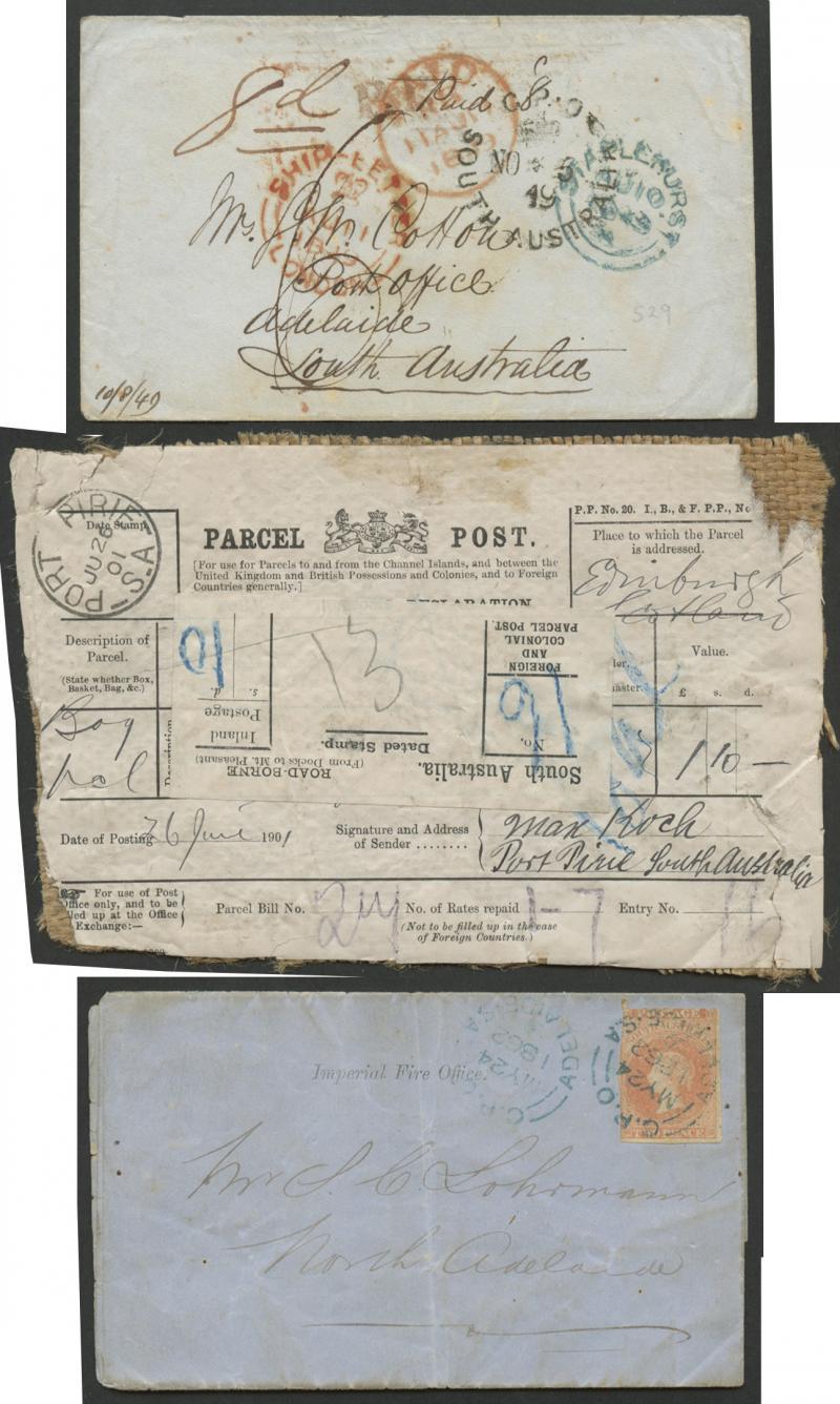 Group including 1849 from London with 'G.P.O/[crown]/SOUTH AUSTRALIA' cds (2-digit year) in black and 1850 local outer with strike in blue (4-digit year), 1860 & 1862 local letters with Second Roulettes 2d (one an Imperial Fire Office folded circular), 1875 to GB with 6d blue, 1878 to Staffordshire with '8 PENCE' on 9d, 1896 OPSO envelope with 1d 'OS' overprint, 1897 Wrapper 1d with superb 'PT DARWIN/SA' squared circle, 1901 'PARCEL POST' label on hessian wrapping to Scotland with 'PORT PIRIE' cds, 1902 to GB with ½d GPO & 2½d blue x2 and curved 'REGISTERED' handstamp, 1912 Reply Card 1d red reply portion used as postcard to GB, etc, also unused stationery including Scenic Postal Cards 'ON THE MURRAY' (Paddle Steamer) & 'PRINCE ALFRED COLLEGE' both very fine and Zieher-type SA stamps postcard unused, condition a little variable but many are fine to very fine.