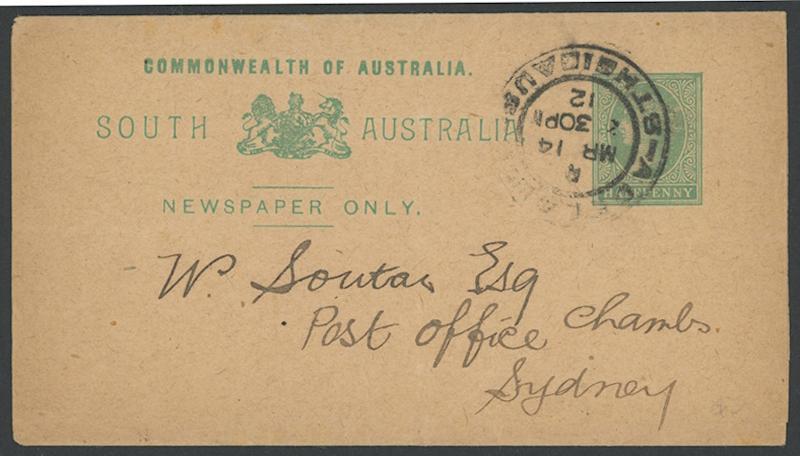 POSTAL STATIONERY - WRAPPERS: 1911 (circa) 'COMMONWEALTH OF AUSTRALIA' ½d emerald as HG E9 but on Unsurfaced Stock, to NSW with Adelaide cds of MR14/12. Very scarce. (Image1)