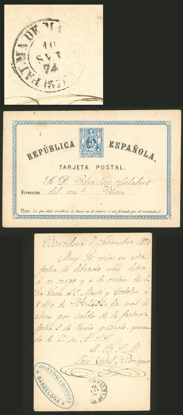 5c. Postal card sent from Barcelona to Palma on 7/SE/1874, with arrival backstamp of 10/SE, VF quality! (Image)