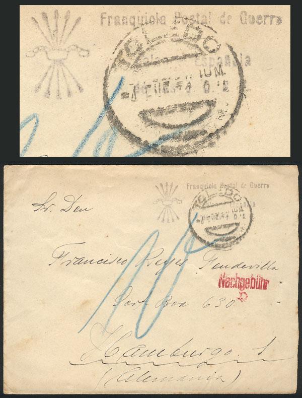 Cover sent to Germany on 7/JA/1937 by a combatant of the Spanish Civil War: "Falangista de Las Palmas (Canarias)", from ILLESCAS (Toledo), stampless and marked "FRANQUICIA POSTAL DE GUERRA", censored and with other interesting marks, rare! (Image)
