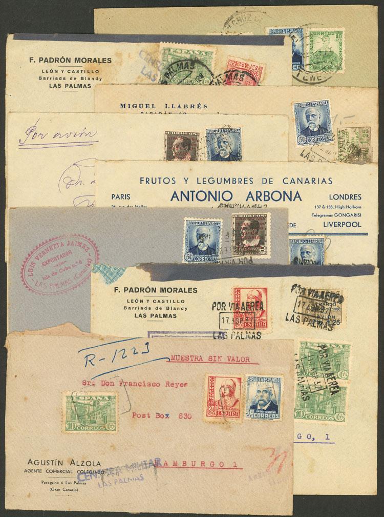 7 Airmail covers + 1 front of registered cover, sent in 1937 from Las Palmas to Germany with nice frankings, interesting! IMPORTANT: Please view ALL the photos of the lot, because all the material has been scanned. (Image)