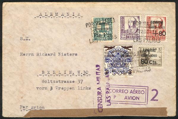 Airmail cover franked with local stamps of the CANARY ISLANDS, sent from Las Palmas to Berlin on 22/OC/1937, with interesting postal marks and censored, VF quality! (Image)