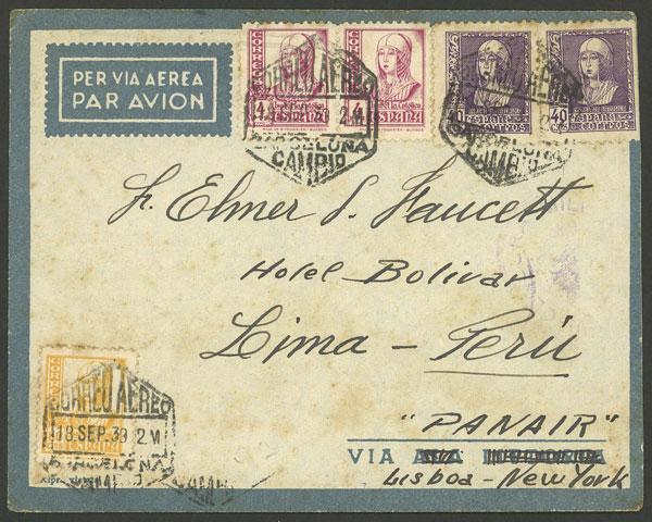 Airmail cover sent from Barcelona to Peru on 18/SE/1939 with colorful postage, via PANAIR, addressed to Elmer J. Faucett, founder of "Faucett Airlines" in Peru, interesting! (Image)