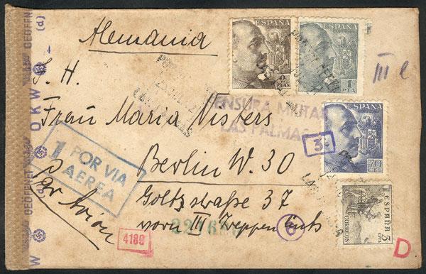 Airmail cover franked with 3.75Ptas. sent from LAS PALMAS (Canary Islands) to Berlin on 23/JUL/1942, with several postal marks and censors (including one Nazi German censor 'OKW'), fine quality, very interesting! (Image)