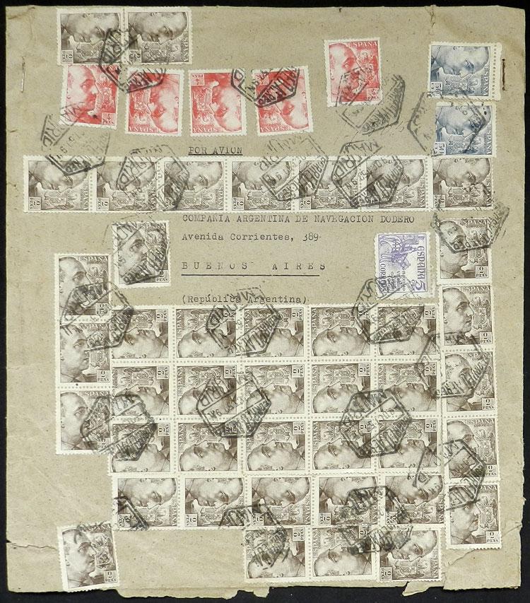 LARGE POSTAGE: Airmail cover sent from Madrid to Argentina on 9/OC/1950 franked with 160Ptas. (with many stamps affixed on front and back, those on back are not cancelled). Some stamps of the original postage may be missing, all the same very attractive! (Image)