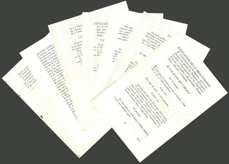 ORIGINAL printed document of 7 pages dated in 1778, indicating the portions that were to be served to passengers of mail paquebots travelling between La Coruña and Montevideo, Puerto Rico, Havana and Canarias, or back. Also with instructions about the values to be charged, other options (if passengers chose to cook for themselves, etc), excellent quality, extremely rare! (Image)