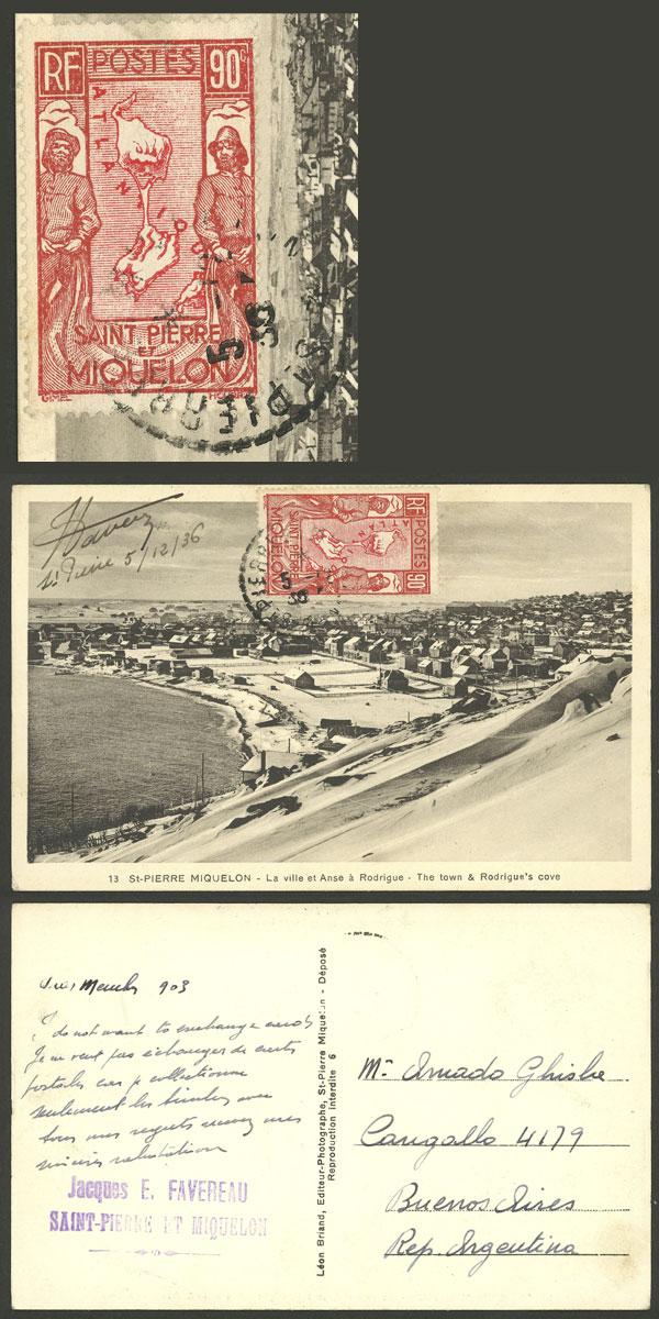 5/DE/1936 St.Pierre - Argentina, postcard with general view of the city, franked with 90c. (Sc.150 ALONE) and sent to Buenos Aires, VF quality, rare destination! (Image)