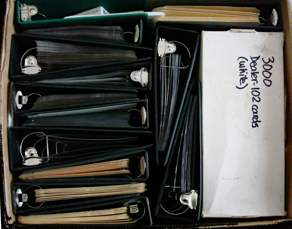 STAMP SUPPLIES, includes 13 dealer 3-ring albums with 110 Mylar pocket pages for displaying 660 dealer 102 cards, plus 4 albums with a total of 50 manila stock sheets, 3 boxes of white dealer 102 cards (3000 cards), a large 96 page White Ace mint sheet file, a box of Avery #5-508 labels, 2 stamp reference books "Stamps" by Harris and "The Royal Hobby" by Wonderlin, retails over $200 US ($300 CDN), VF est ($50+ US) (Image)