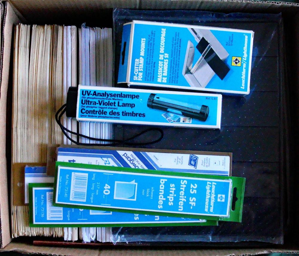 STAMP SUPPLIES, includes about 140 both single and double sided stock sheets (mostly Vario) with between 1 and 8 pockets, also a nice range of coin sheets and 6 pocket postcard sheets, a stack of 8 pocket manila stamp sheets, a selection of Hawid mount packs, a Hawid mount cutter, a watermark detector, and an ultraviolet light, retails over $150 US ($200 CDN), F-VF est ($15+ US) (Image)