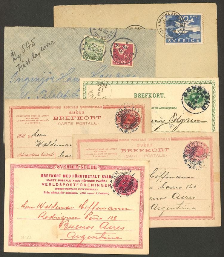4 Old postal cards used between 1891 and 1901, one with the paid reply attached + 2 airmail covers of 1936 and 1946, good lot! IMPORTANT: Please view ALL the photos of the lot, because all the material has been scanned. (Image)