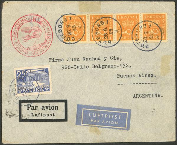 28/JUN/1935 Göteborg to Argentina, airmail cover sent via Germany DLH franked with 4.25Kr., arrival backstamp, very nice! (Image)