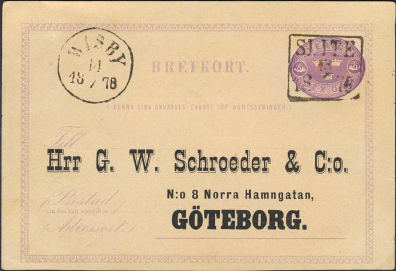 Sweden, I-county. SLITE 13.7.1878, rectangular postmark Superb–EXCELLENT postcard sent via WISBY 14.7.1878 to Gothenburg. Scarce pmk to find on cards. (Image1)