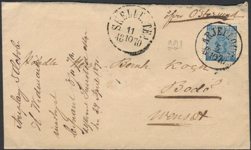 Sweden, BD-county. ARJEPLOUG 5.10.1870. Superb cover with notation 'öfver Östersund' via SKELLEFTEÅ 11.10.1870 to Bodø, Norway. Postal: 1500 SEK (Image1)