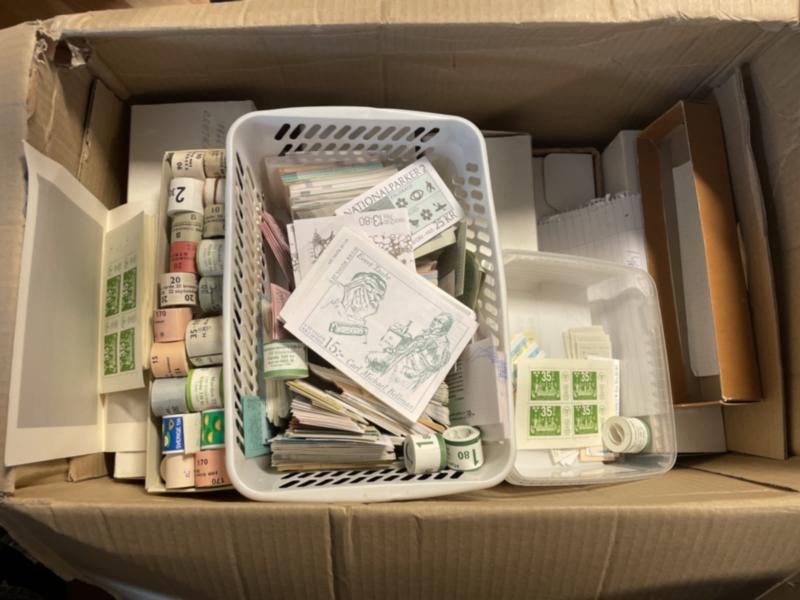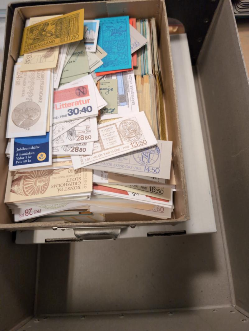 Sweden, Booklets accumulation 1960–2005 in removal box. 14 albums and boxes filled with booklets from the period. Also older booklets in the material (H7– ) and some single stamps, sets, series. Total franking value more than 28000 SEK. Ex. Contenta. Excellent quality Approx. 12 kg.