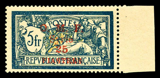 N°67a, 25 pi. s. 5 f. bleu et chamois surcharge rouge, bord de feuille latéral (tirage 50 exemplaires), R.R.R, SUPERBE (signé Calves/certificats) Qualité: * Cote: 12500 euros (Image)