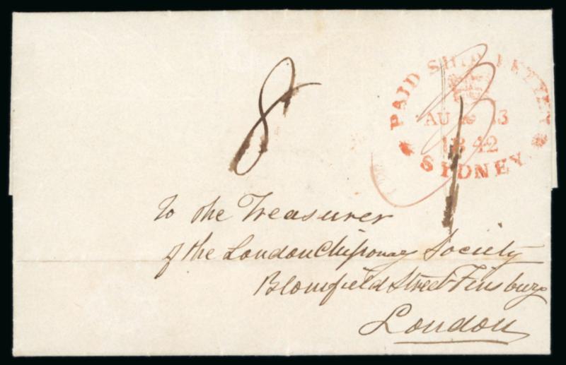 Samoa 1840-50s group of missionary mail with 1842 (10 May) entire to London with crisp red Paid Ship Letter Sydney date stamp of Aug 3 and doceted as arrived on Jan 7 43, 1850 entire following same route with a less clear Sydney date stamp, plus 1845 incoming entire to Upolu from Glasgow, black Sydney ship letter transit date stamp and carried privately to the island. also with two late 1850s entires without markings, one from Henry Nisbet to his wife, written at Palauli to mission at Safotutafai, the other from his son at school in Newtown, NSW, Australia, both carried by favour. (Image)