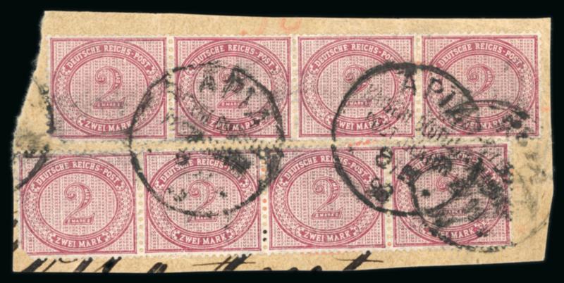 German Postal Agency accumulation of pieces and covers with 1897 10pf pair on envelope to Hamburg, 10pf single and 20pf pair pieces, 20pf on piece with large part framedBezahlt date stamp, 1896 20pf cover to Leipzig, 1897 triple rate creased cover to Vienna, endorsed S.S. Mariposa/ via San Francisco franked 10pf and 50pf, arrival backstamp and small 1898? piece bearing two horizontal strips of four 2m. (Image)