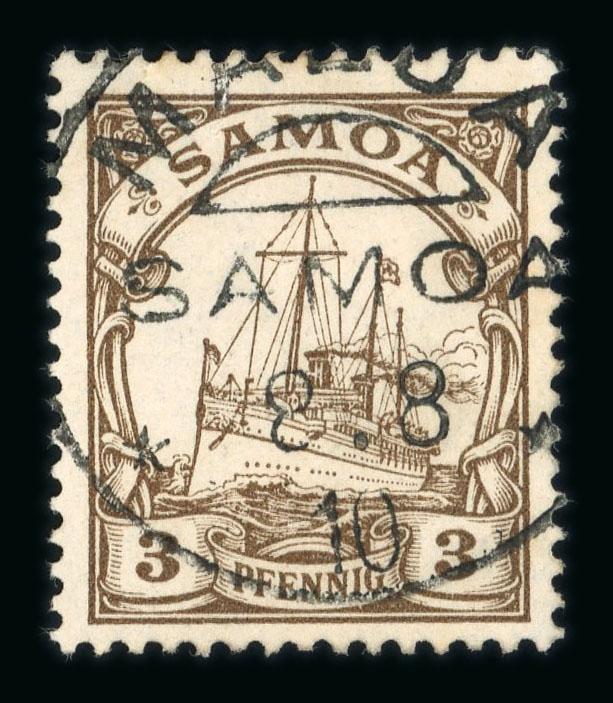German Post Office used collection on neatly writte-up leaves commencing with 1900-01 set of six used with extra 25pf used on piece,1900 Yacht set used to 5m with Dr Lantelme BPP handstamp on 5m piece, postmarks with noted Malua on 3pf and Palauli on 10pf, postal history with 1898 SMS Falke Marine Schiffspost, covers and postcards, etc (Image)