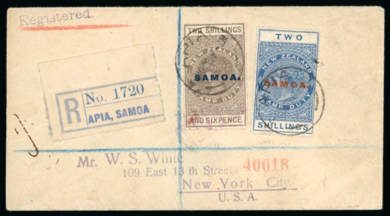 Samoa 1910-20s New Zealand overprinted Postal Fiscals with set of seven hinged mint including £2 that was only ever used for fiscal purposes, used values sorted into the three issues nearly all used except SG 128 and 129, also with 1918 registered censored cover bearing 5/- and 2d yellow, good to fine condition.