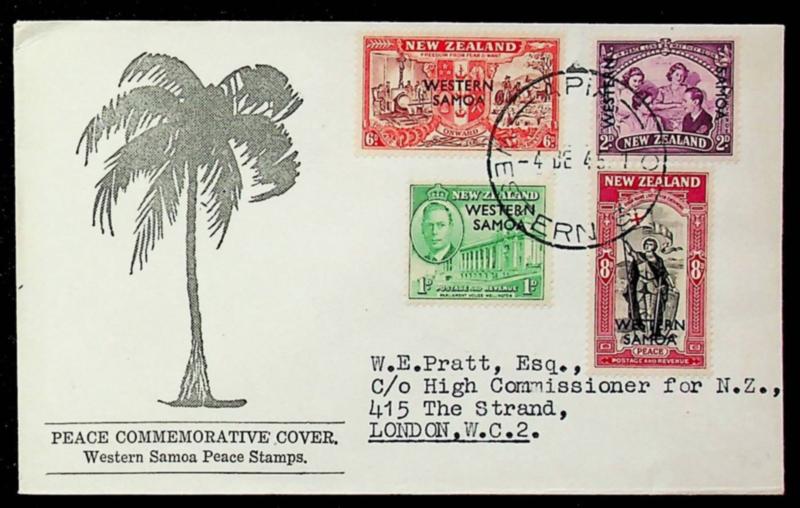Western Samoa ovpt on New Zealand Peace 4v 1945 cover from Apia to London England (Image)