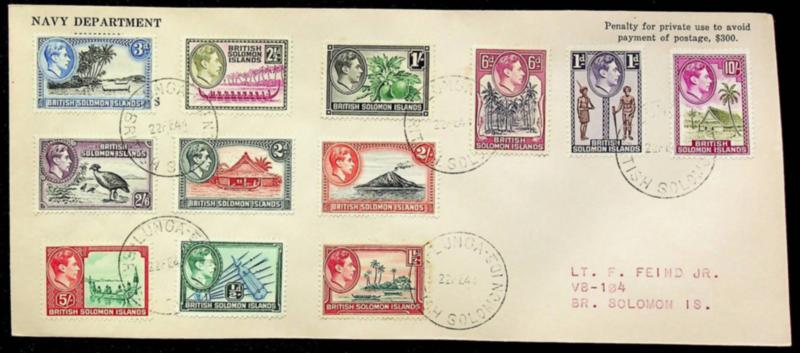British Solomon Islands 1944 WWII KGVI Pictorial issue 12v on Navy Penalty cover from Lunga (Image)