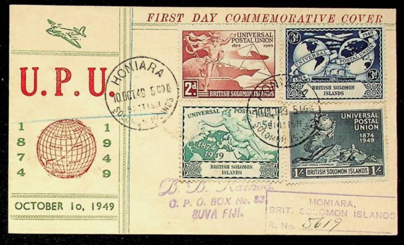 British Solomon Islands 1949 75th Anniversary UPU 4v on FDC w/ 1d at back from Honiara to Suva Fiji (Image)