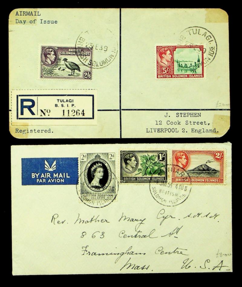 British Solomon Islands 1939-54 2 airmail covers w/ KGVI & QEII issue, 1 Regd to England/ USA (Image)
