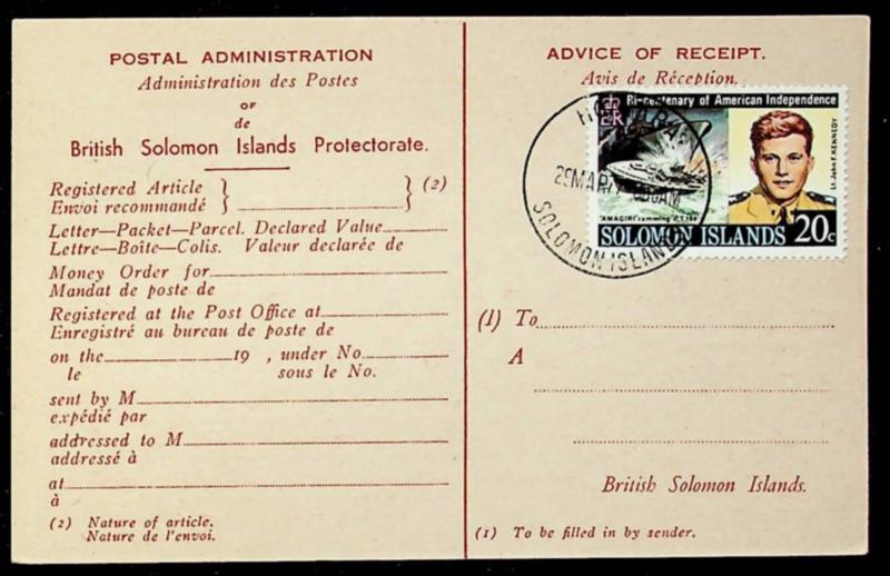 Solomon Islands 1977 US Bicentenary 20c on Advice of Receipt card w/ "Honiara" cancel (Image)