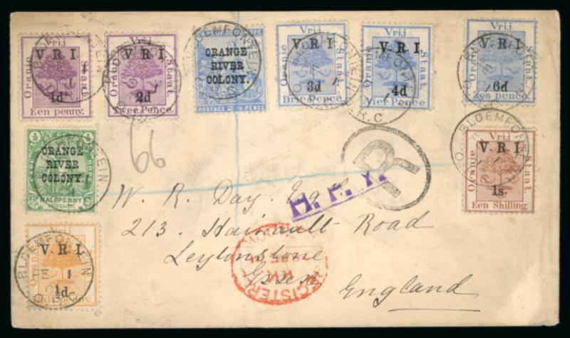 1890-1900, group of censored mail (6 covers) including 1900 (7 Dec) uprated V.R.I. registered stationery, the 1d stamp with no stop variety, 1901 registered cover to England with multi V.R.I. issues and O.R.C. issues with violet H.P.Y. handstamp of H.P. Young the censor in Bloemfontein, 1d V.R.I. covers Opened Under Martial Law and a E.R.I. 1d cover to North West Provinces, India; ex. Weinman-Lays. (Image)