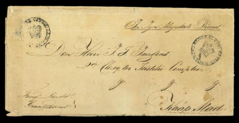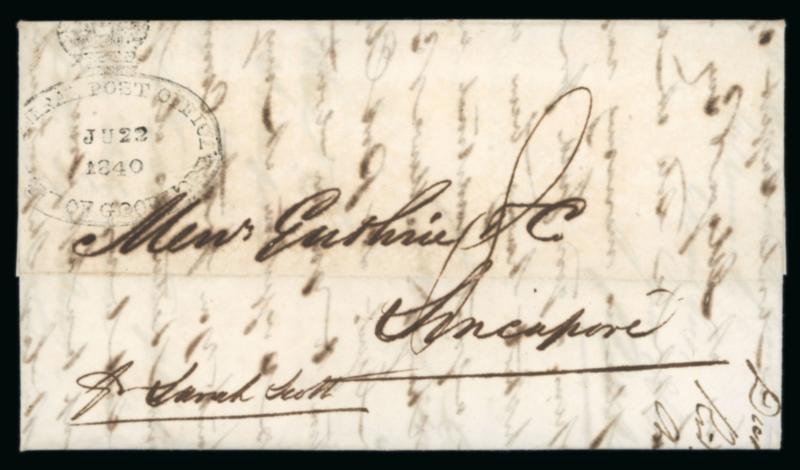 1840 (23 November) Entire letter from the Cape "pHebe" to Singapore, rated "8" and showing fine Crowned "General Post Office/Cape of Good Hope" DLS4 (the new type made from brass) on face, a fine usage to a very rare destination. (Image)