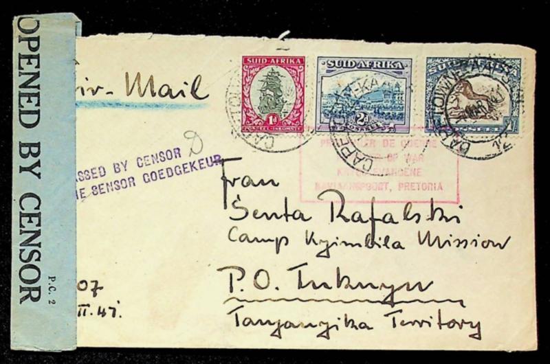 South Africa 1941 WWII 3v censored airmail cover via Durban/ Dar es Salaam to Tukuyu Tanganyika (Image)