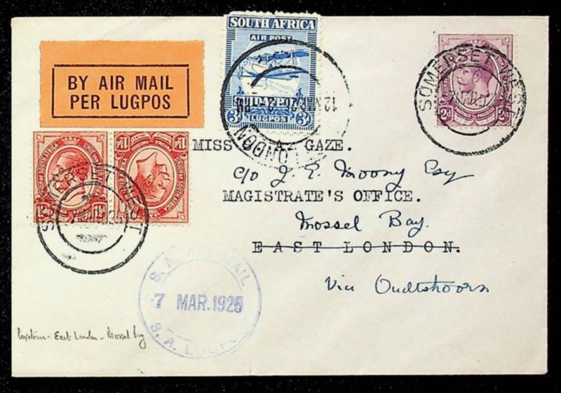 South Africa 1925 KGV 4v on airmail FFC from Somerset West to East London redirected to Mossel Bay (Image)