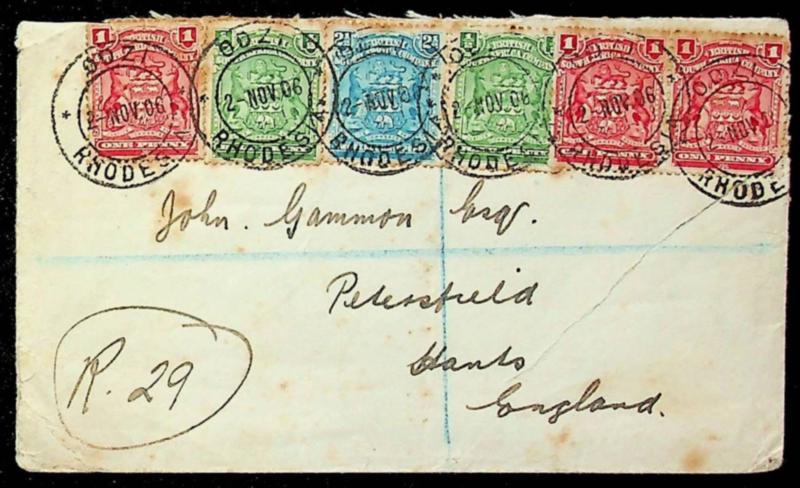British South Africa Company 1906 6v on Regd 29 cover from Odzi Rhodesia via Salisbury/ London to Petersfield England (Image)