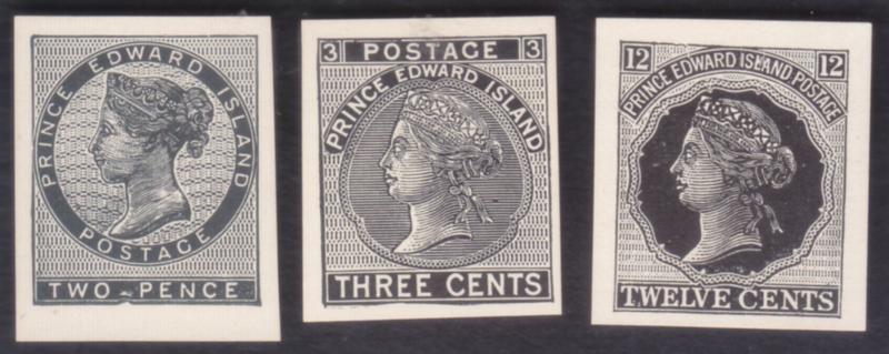 Prince Edward Island QV 3c, 12c + 2d all being Die Proof on thick card Rare (Image)