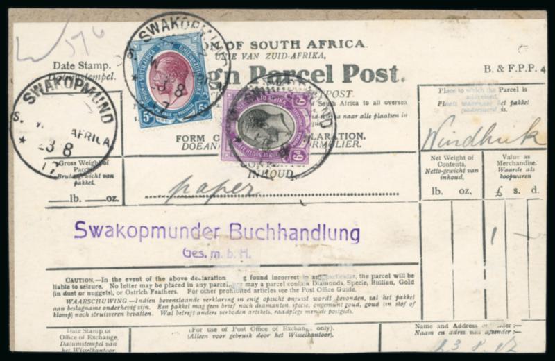 Forerunner: 1917 Union of South Africa Foreign Parcel Post form tied to parcel front from Swakopmunder Book Dealer to Windhuk, bearing 6d. and 5/- tied Swakopmund cds with another strike alongside, a rare commercial item (Image)