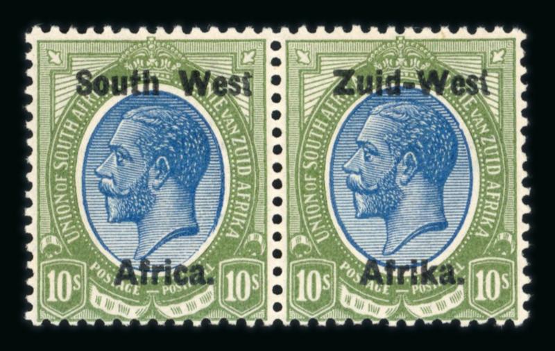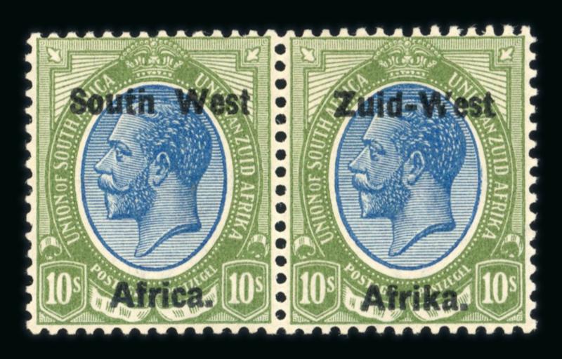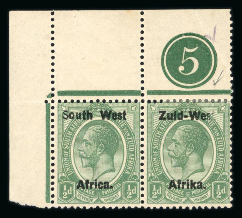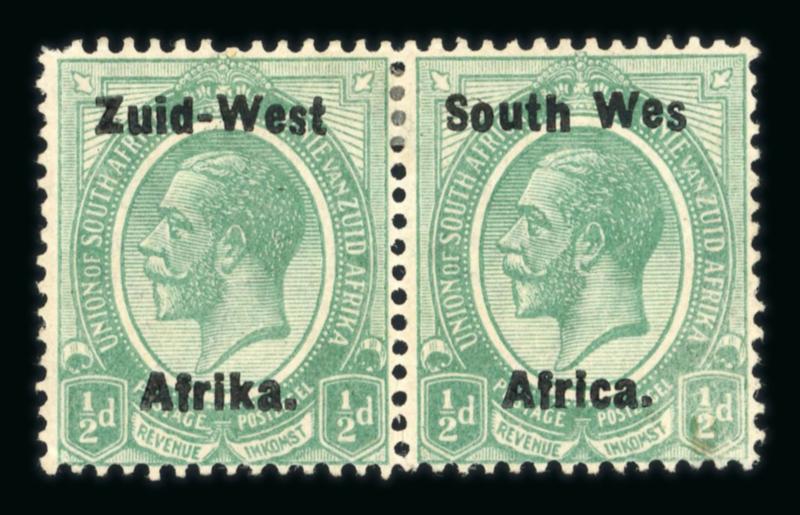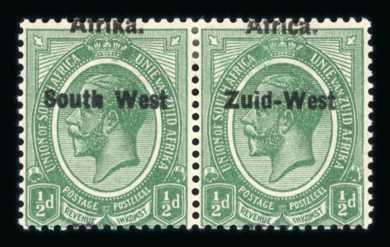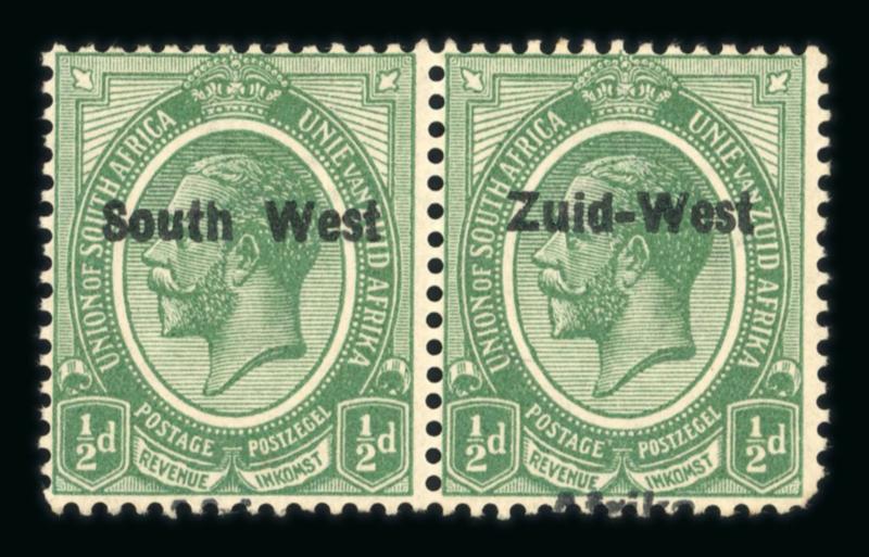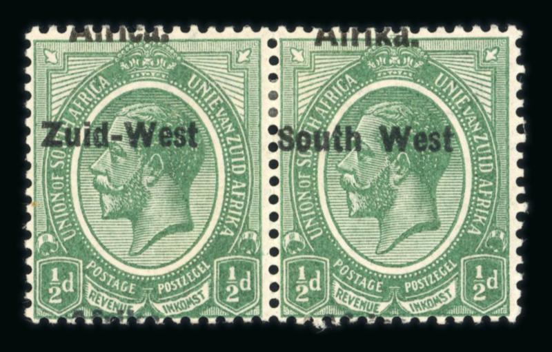 1923 Type I 1/2d. green pair showing Africa/ Afrika above Zuid-West and South West, fresh hinged mint (Image)
