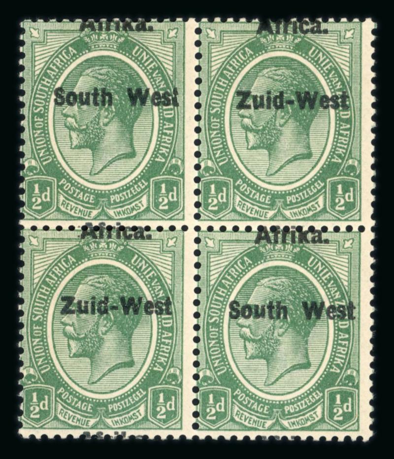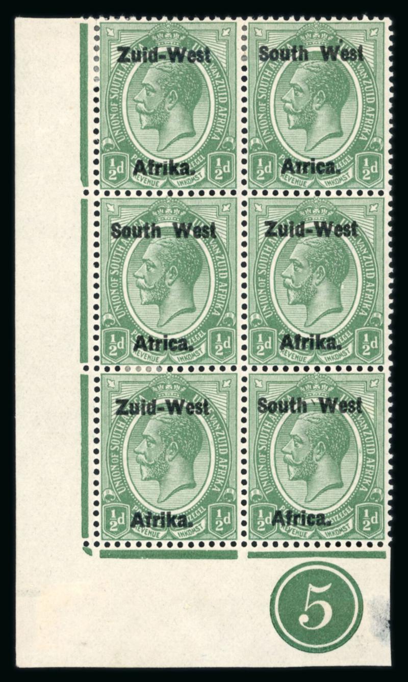 1923 Type I hyphenated 'Zuid-West' accumulation of varieties 'dropped stop' after 'Afrika' with 1/2d. pair and block of four, 1d top margin gutter block of 12, plus 2d. to 2/6d pairs with two 3d. pairs, mostly fresh hinged mint