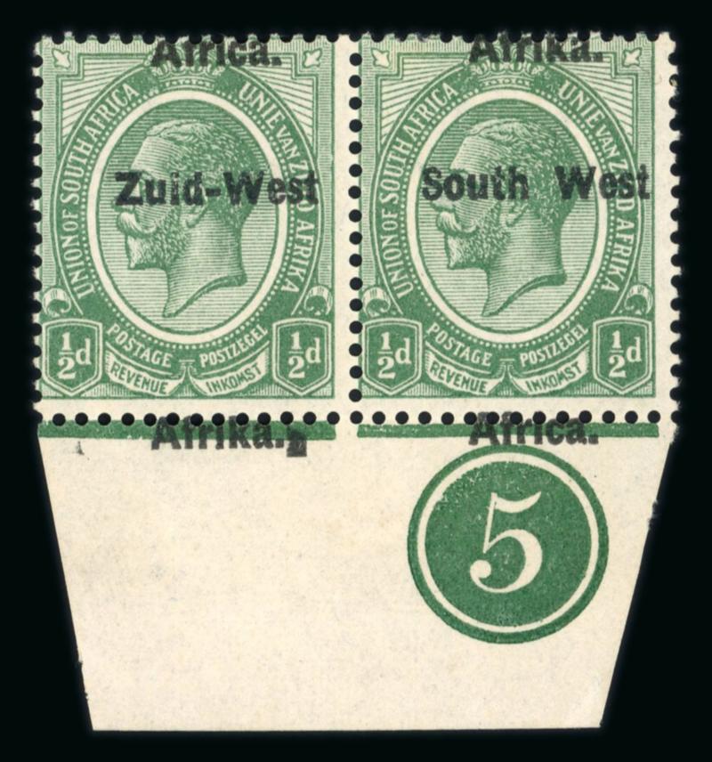 1923 Type I 1/2d. green bottom margin plate 5 horizontal pair showing Afrika/ Africa above South West and Zuid-West, hinged in margin only, stamp never hinged (Image)