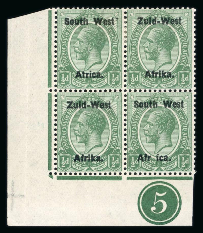 1923 Type I 1/2d. green, two plate 5 bottom corner blocks of four, one showing 'Afr ica' spacing variety, the variety never hinged and a similar plate number block showing a misplaced overprint mint never hinged. (Image)
