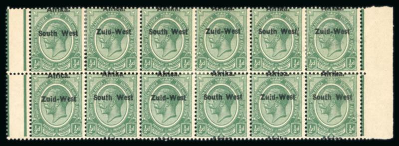 1923 Type I 1/2d. green in block of 12 with gutter at left and margin right, each stamp showing Africa/ Afrika at top running slightly upwards from left to right and showing part overprint at base to an increasing degree, mostly hinged along top with some perf reinforcements. (Image)