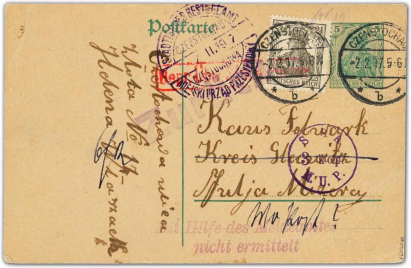 1917, Ganzsache 5 Pfg. DR (P 106) mit Zus.-Fr. 2½ Pfg. (Mi-Nr. 98) ab Czenstochau 2.2.17 nach Kreis Gleiwitz ohne Poststellenangabe. Über Marke handschr. =Br. 5 f = verm. Gebühr. Mit PÜ Posen - dann zurück, da ohne Zustellort. Dann Stadtpost viol Stadtpoststempel 2 mit Zustellgebührenstempel Nr. 10 =3 kop=. Dazu "Mit Hilfe des Meldeamtes / nicht ermittelt". Sign. Petriuk und Fotoattest Petriuk. (Image)