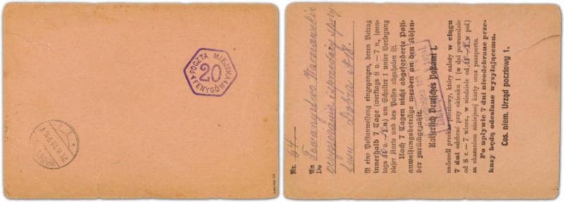 1918, Benachrichtigungskarte über POSTANWEISUNG 2sprachig Warschau 1 21.8.18 mit Zustellgebührenstempel =20= fen 6eckig - violett. Karte mit Einriss unten. Es gibt nur wenige dieser Banachrichtigungen mit der Zustellgebühr. Sign. und Fotoattest Petriuk. (Image)