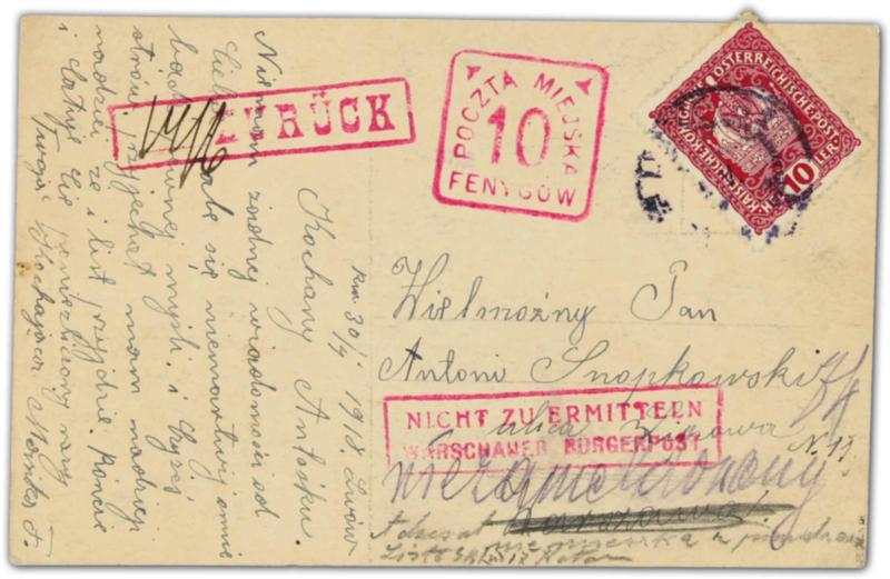 1917, Firmenumschlag mit 15 Pfg. Germ. viol. Gen.-Gouv. Czenstochau 3.12.17 nach Warschau. Dort Bürgerpost nicht zu ermitteln und zurück 19/12. Dann Zustellgebühren-Stempel =10 fen.= viol. - und RS Stempel Stadtpost. Umschlag links oben Klebestelle unterlegt, etwas verkürzt und waag. Faltung. Sign. Petriuk BPP. (Image)