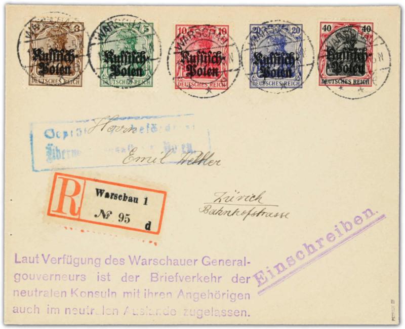 1916, Umschlag mit 3 bis 40 Pfg. Germ. Russ.-Polen ab Warschau 19.8.16 als Einschreiben nach Zürich. Geprüft und zu befördern PÜ Posen - dazu L4: Laut Verfügung des Warschauer Generalgouverneurs ist der Briefverkehr der neutralen Konsuln mit ihren Angehörigen auch im neutralen Auslande zugelassen. Ankunft Zürich 23.VIII.16. Sign. Petriuk BPP - natürlich nicht portogerecht, aber neutrales Ausland. (Image)