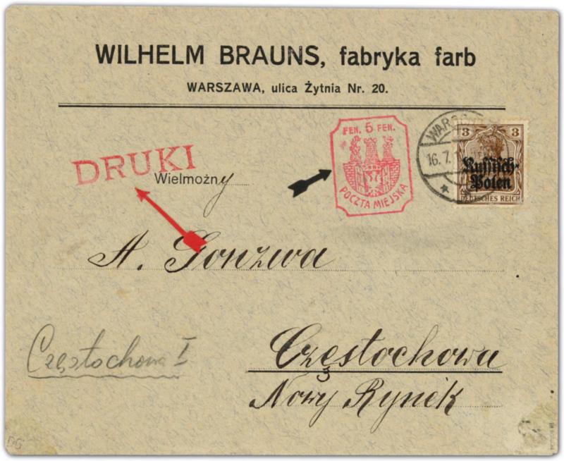 1917, Firmenumschlag als Drucksache 3 Pfg. Germ. Russ.-Polen als EF Warschau 16.7.17 nach Czenstochau, dort auf RS Stadtpoststempel viol Nr. 2 L und auf VS Zustellgebührstempel 5 Fen rot - sign. und Fotoattest Petriuk (Image)